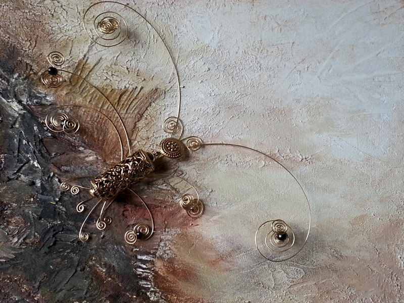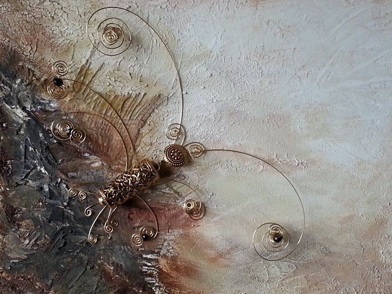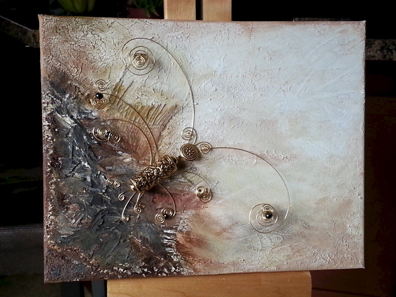 I have married my two creative passions...jewelry and painting! I painted a beautiful textured earth tone backdrop on this 11 x 24" canvas. But the focal is my take on an abstract butterfly created with handmade wire wrappings, crystals and a lovely vintage earring creating this 3D painting. A cross between sculpture and painting, it is painted on the edges so it is complete and ready to hang. Sure to be a conversation starter!