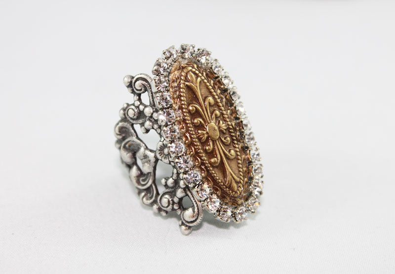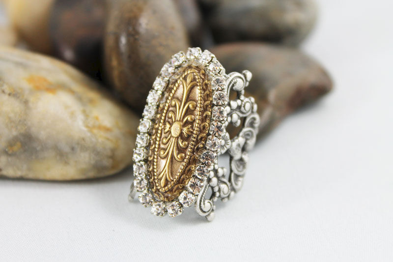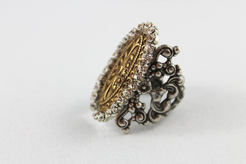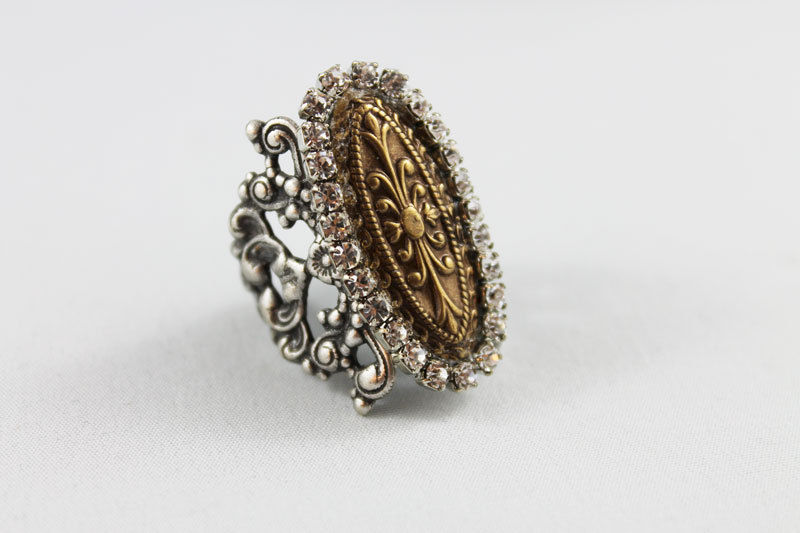 With a 31 x 16 mm brass center surrounded by lovely rhinestones this oxidized silver filigree cocktail ring makes such a statement! While the back of this ring is open I have formed it as size 7. I can adjust it to fit from as small as a size 6.5 to a maximum size 7.5. Please indicate size upon checkout.