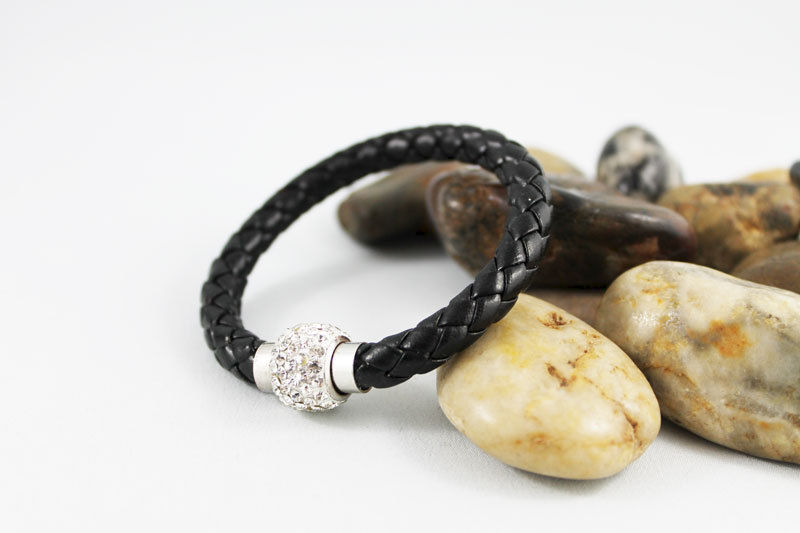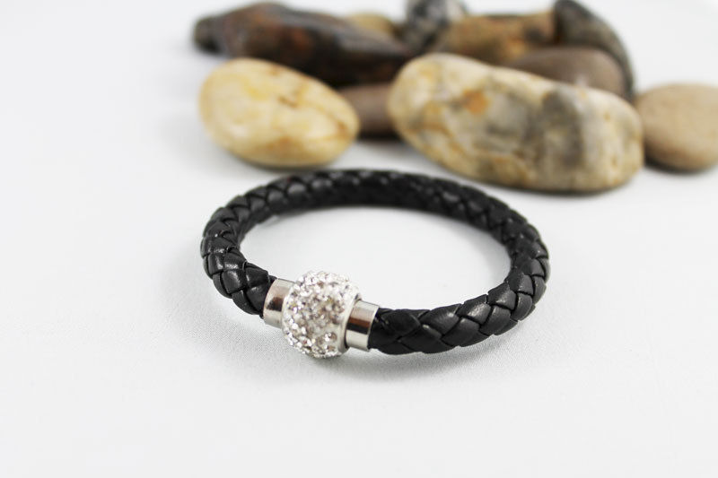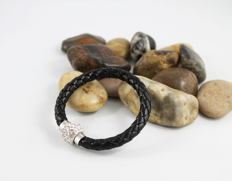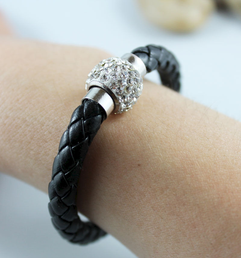 This bangle bracelet is great for any occasion. 6mm round black braided leather cord is connected by a beautiful rhinestone bead like magnetic clasp. Easy to put on, this will easily become your go to bracelet! The bracelet pictured fits a 6" wrist.