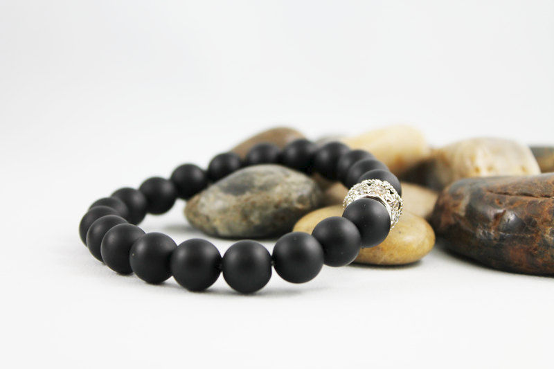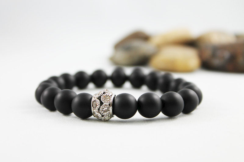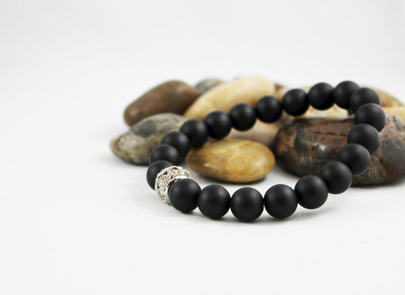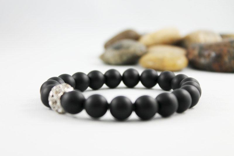 With 10mm black matte onyx beads and a 12mm x 8 mm rhinestone spacer as a focal, this handmade stretch bracelet is sturdy and beautiful!