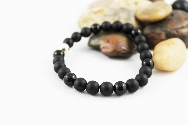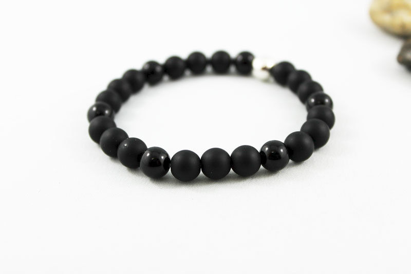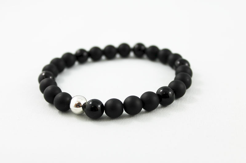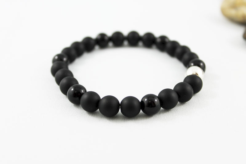 8mm matte and shiny onyx beads have been strung (3 to 1) on an elastic cord with an 8mm silver plated bead as the focal. Great stacking bracelet for men and women!