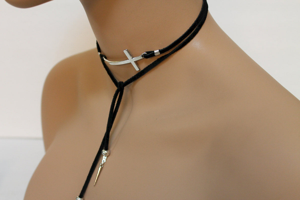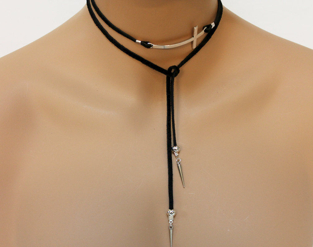 Black Suede Silver Sideway Cross Lariat