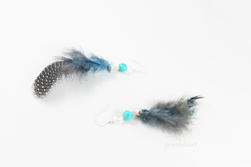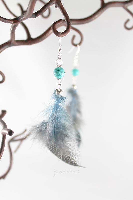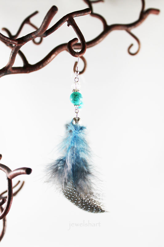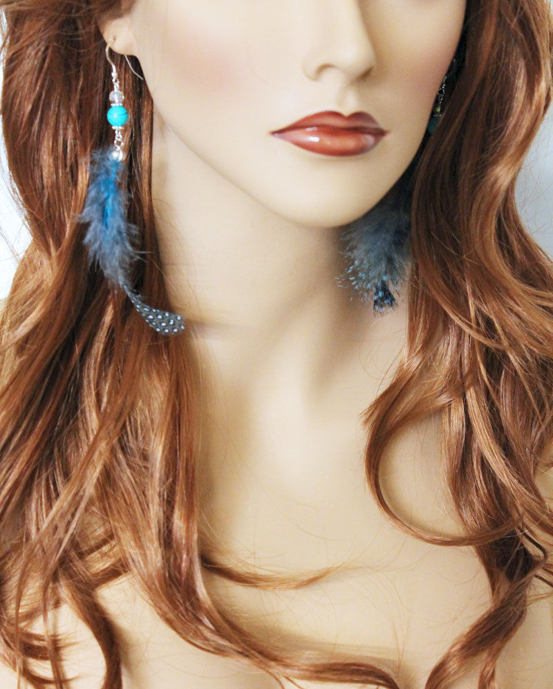Turquoise and crystal beads dangle with the 3" blue feathers to create these whimsical fashion earrings. Sterling silver hooks. Earrings measure approximately 4" from hook.