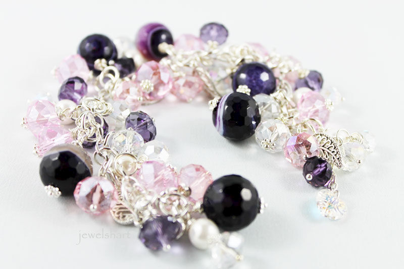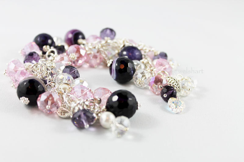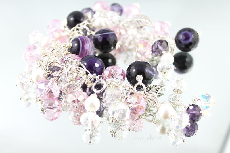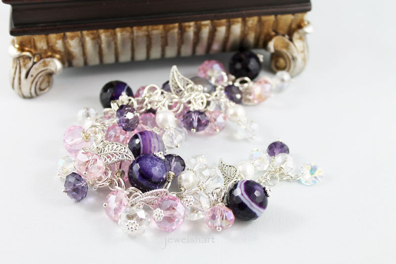 Purple Bliss! Beautiful 16mm round purple agate, 6mm Mother of Pearl, various pink, purple, clear crystal and Swarovski crystal beads come together to form this dazzling cluster bracelet. Pretty 10 x 16mm leaf charms add just the right amount of jangle. This bracelet measures approximately 7.5" with a 1.5" extension. It can be adjusted by fastening the clasp to one of the many rings along the chain.