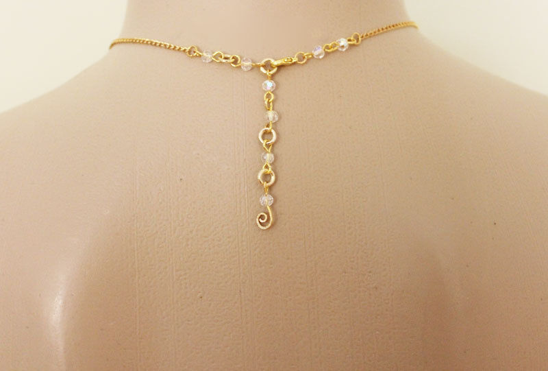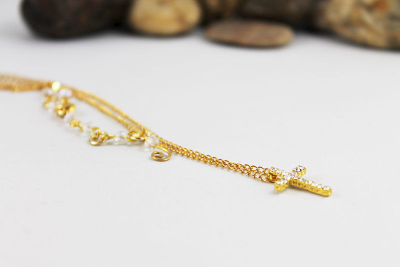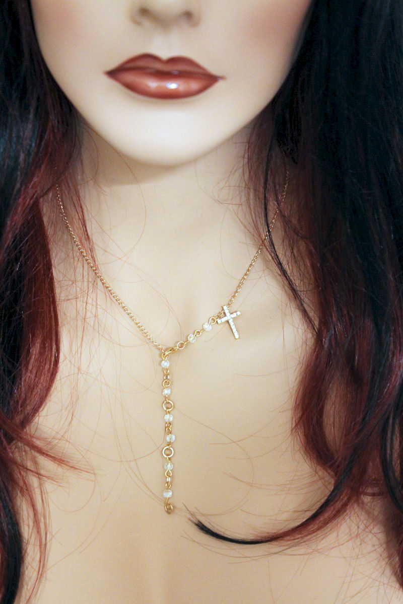 This is such a pretty, dainty necklace that is great for any day! A sparkly 17 x 13 mm rhinestone cross pendant is the focus of this 16" choker length 14k gold plated chain. I have added a crystal beaded extension which measures approximately 3" with a pretty wire wrapped crystal to finish it off so that the back is beautiful too!