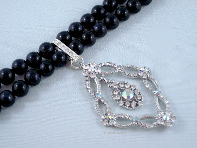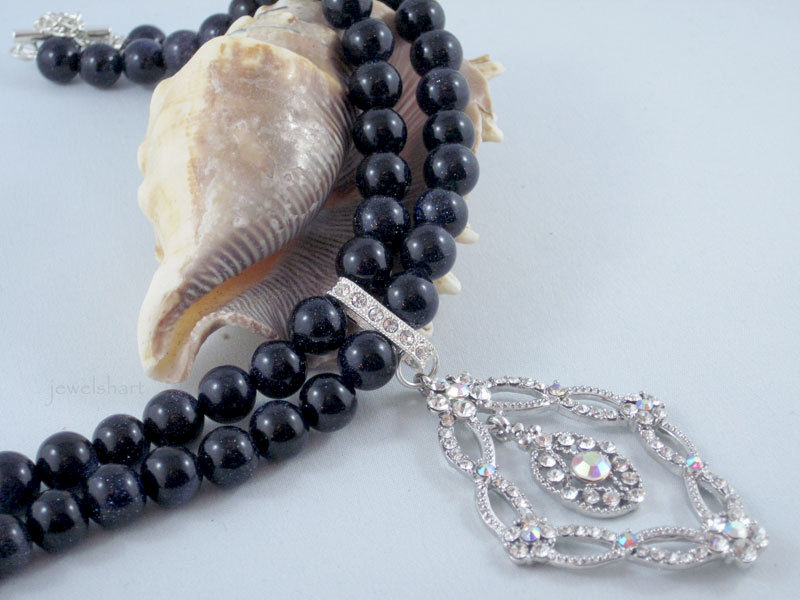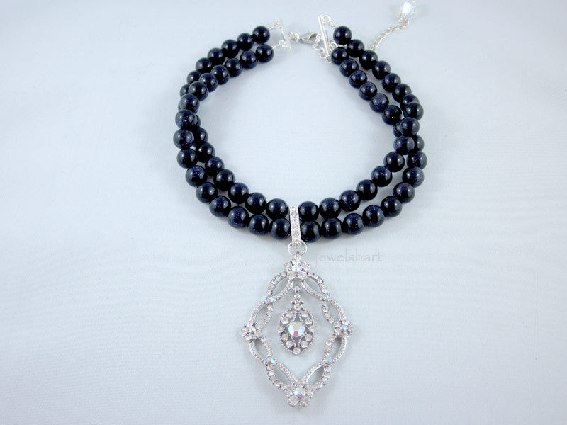 The beautiful large rhinestone pendant is the focal point of this lovely double strand beaded choker necklace. Dangling from the 20 mm rhinestone connector is a diamond shaped pendant which measures 166 x 44 mm and within it dangles a 25 mm oval pendant. Double strands of 10 mm natural blue sandstone are strung together and with their natural sparkle make this necklace dazzling! Wear it either as a choker or use the extension to wear it lower as a necklace. Beautiful either way. It is said that blue sandstone symbolizes enterprise, success, victory and glory, which can enhance the power of strong leadership and be able to enhance the body's good spirits, drive out evil spirits; clear the mind and relieve pressure. All that and it's beautiful too!