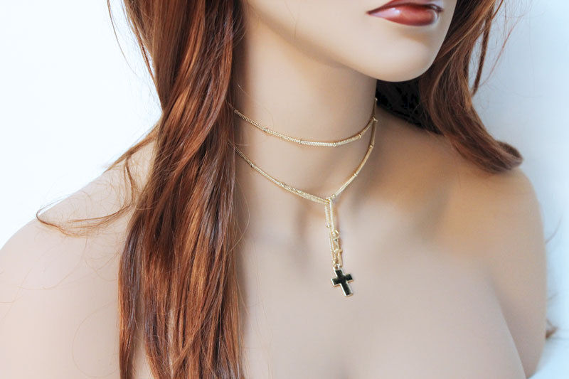 Gold Cross Necklace, Dainty Gold Lariat, Thin Rose Gold Religious Jewelry. Gift Idea For Her