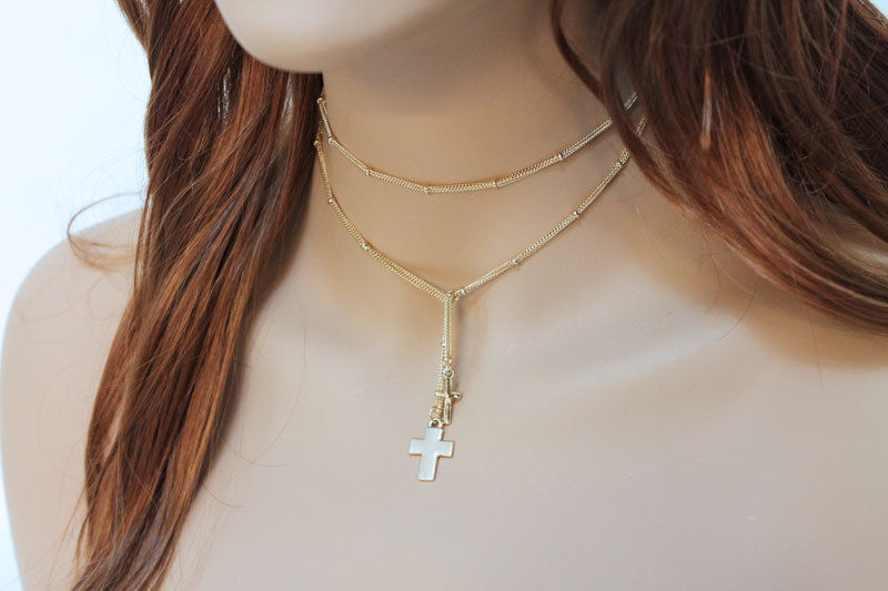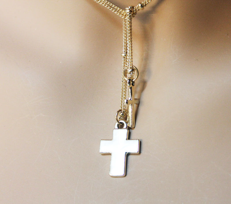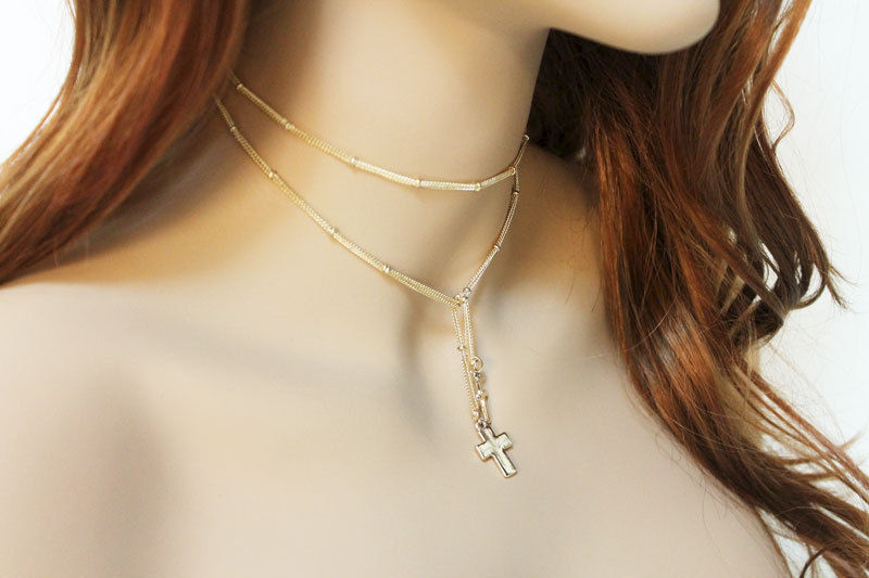 This dainty cross necklace is so pretty! The chain is a cross between gold and rose gold tone. With a 22x15mm cross at one end and an 18x12mm cross at the other end of this lariat necklace, you can wear it wrapped or long. Either way beautiful!