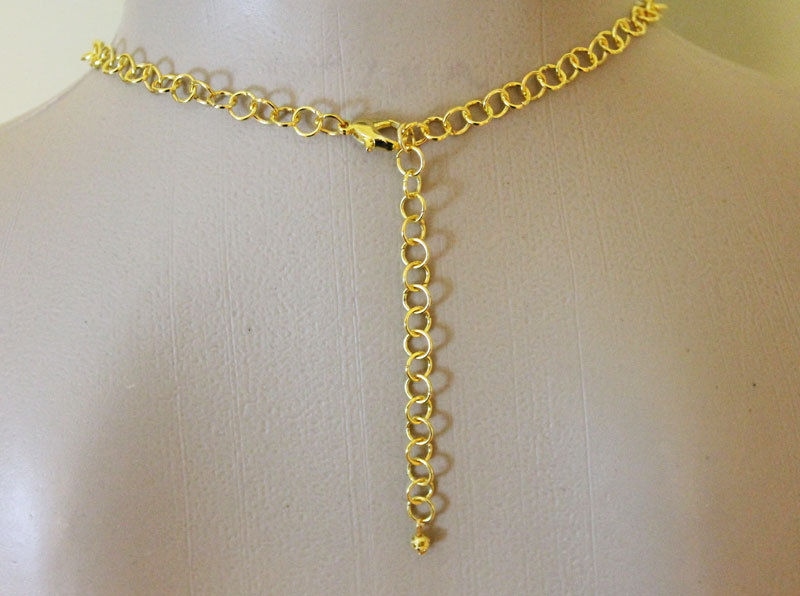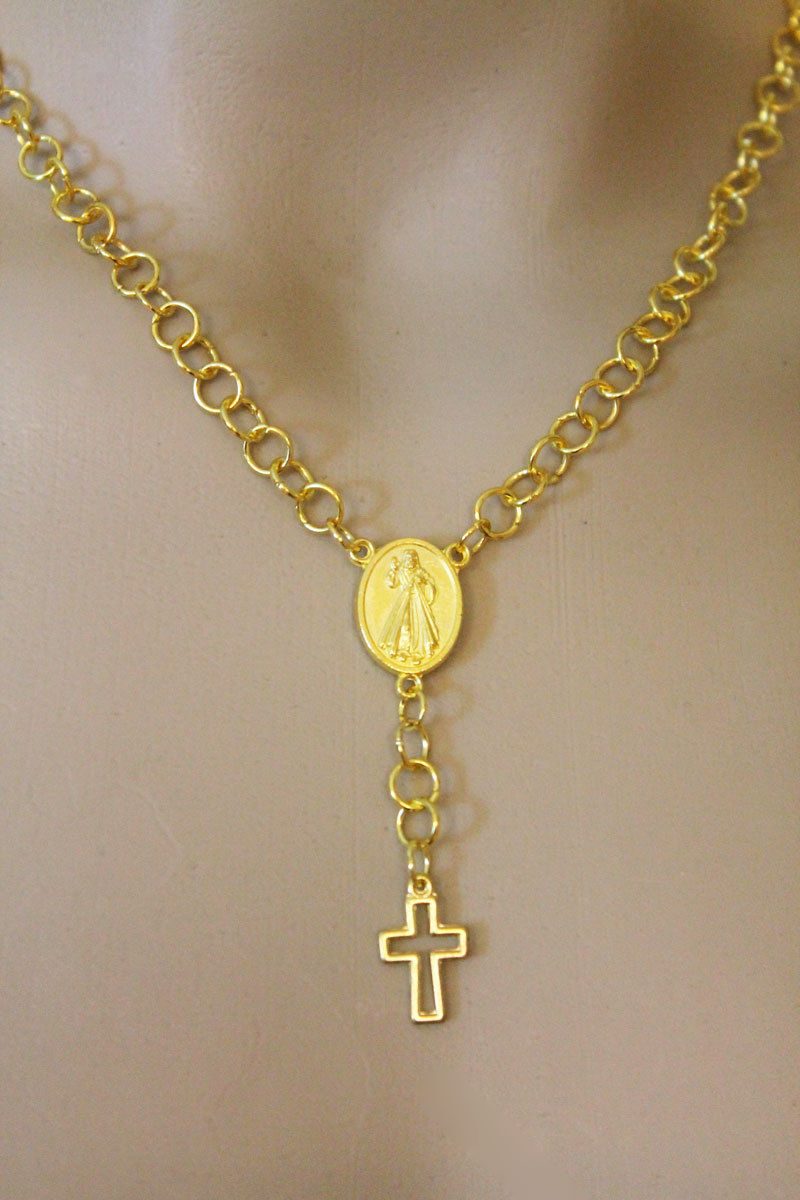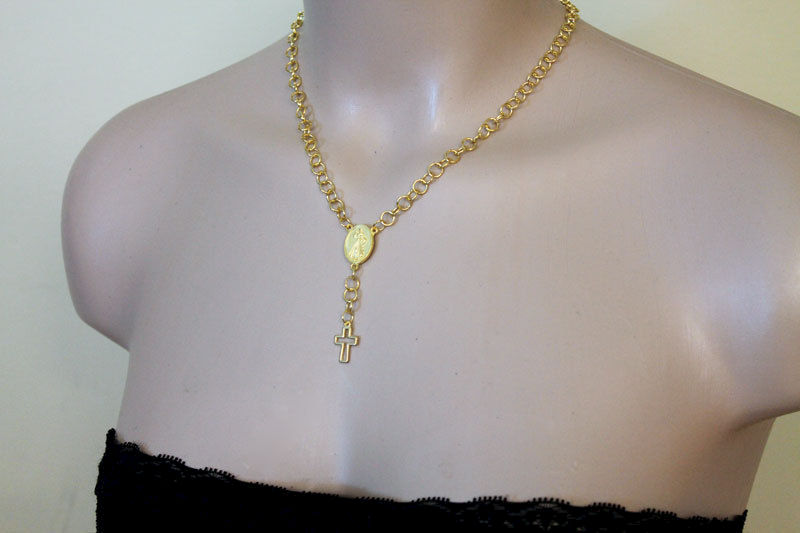 6 mm gold plated jump rings have been linked together to form the handmade chain of this lovely rosary style necklace. The 16 x 12 mm Madonna medallion in the center of this necklace is actually double sided so you can wear it both ways. From the medallion dangles more chain which ends with a modern 15 x 10 mm cross pendant. This necklace measures approximately 18" with a 3" extension of the same handmade chain. A tiny 4 mm gold plated filigree bead completes the end of the chain.