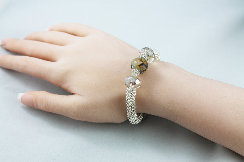 This pretty stretchy bracelet has lovely 14 mm green agate and smokey crystal beads. Perfect for any occasion. Measures approximately 7" in circumference.