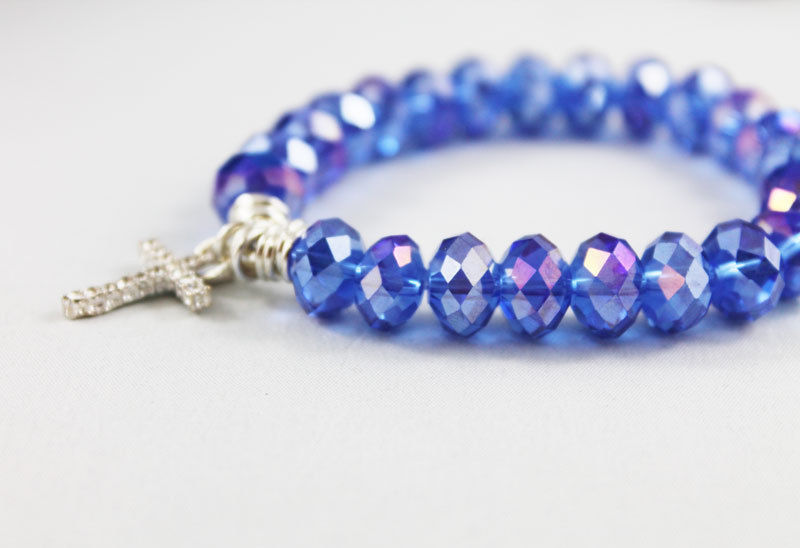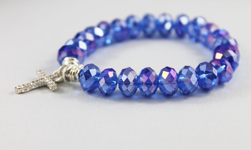 The 10mm crystal beads I used for this bracelet are a lovely vibrant blue with purple undertones. These lovely crystals are strung on an elastic cord and dangling in the center is a pretty 18 x 12mm silver tone rhinestone cross. Great for stacking! Please indicate size preference upon checkout.