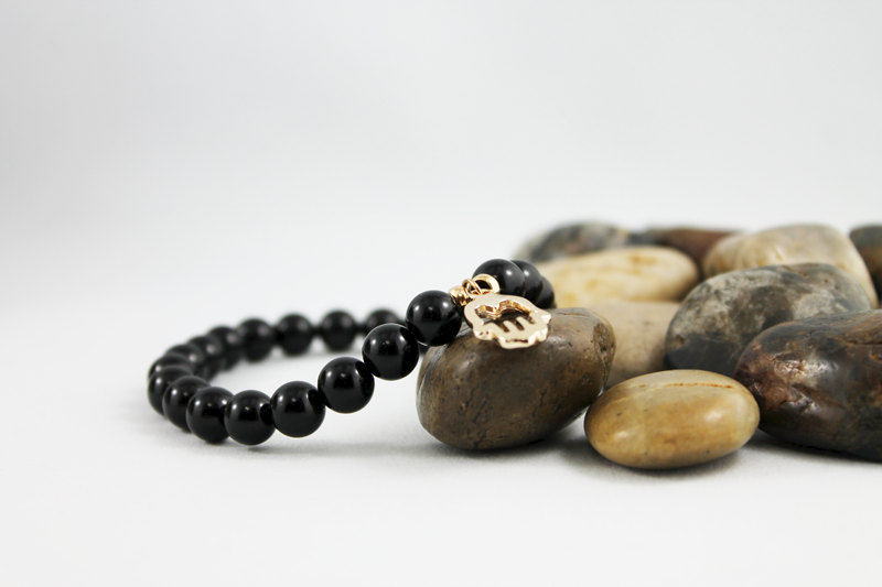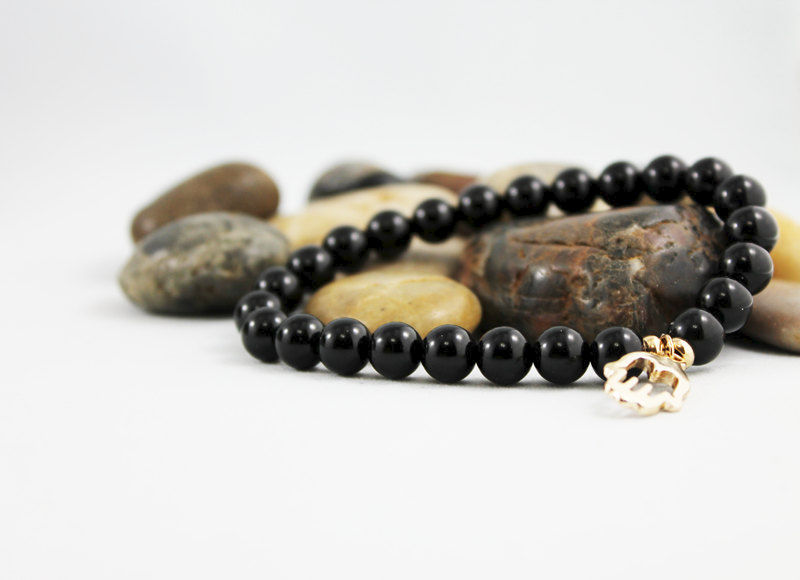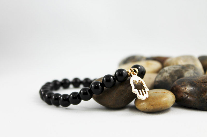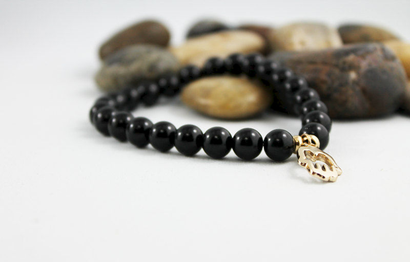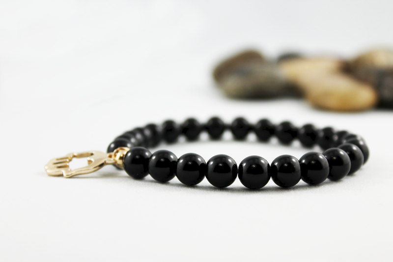 This stretch bracelet is great for men and women! 8mm onyx beads have been strung on a strong elastic cord. With an 18x10 mm gold tone hand charm nestled between two 5mm gold tone spacer beads it's perfect for everyday! Fits a 7" wrist.