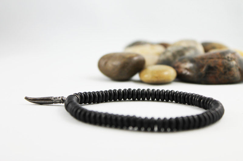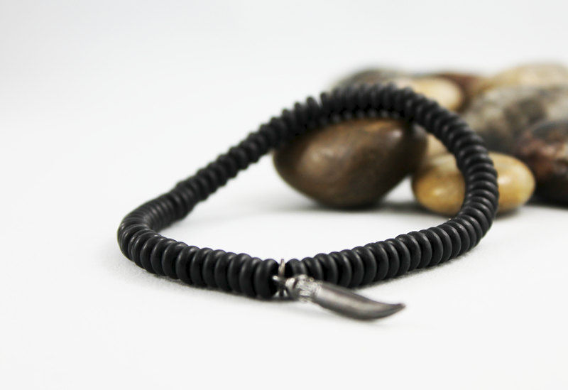 These 4 mm flat matte onyx beads resemble small discs. Strung together with a 22 mm black horn charm this bracelet is great alone or stacked with other bracelets. Fits a 7" wrist comfortably.