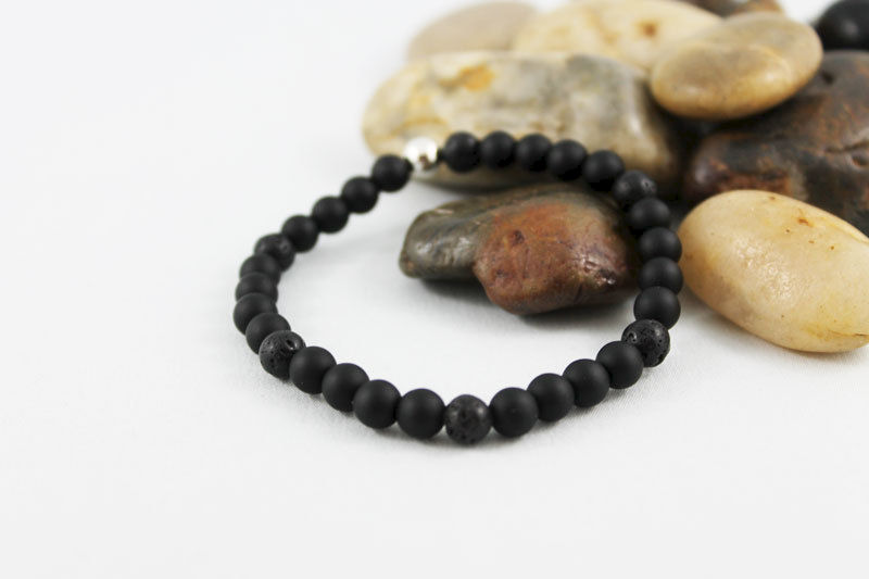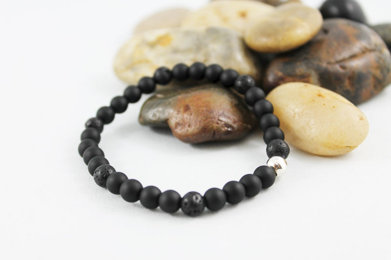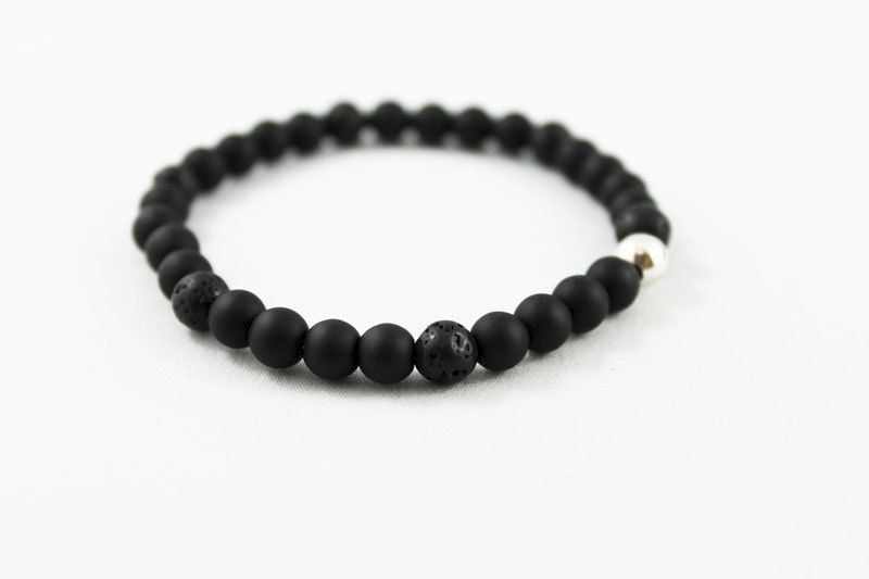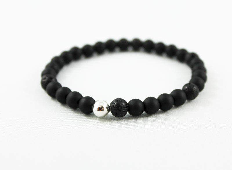 This stretch bracelet has 6mm black matte onyx and lava beads strung together on an elastic cord (4 to 1 pattern) with a 6mm silver plated bead as the focal. Great stacking bracelet for men and women! Fits 7" wrist.