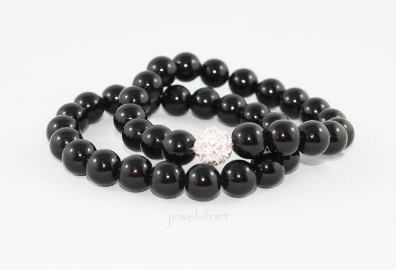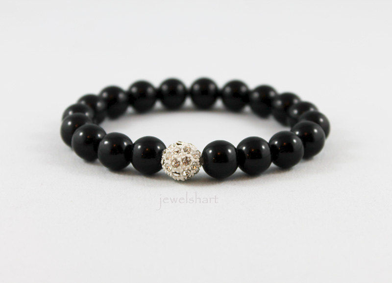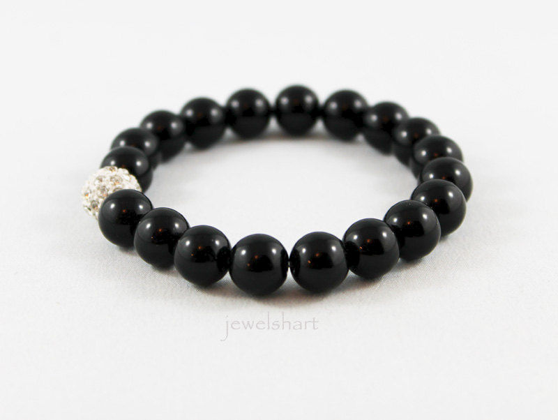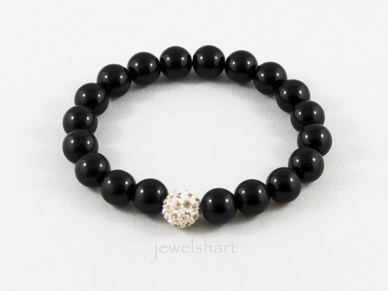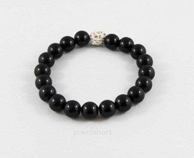 Strung on an elastic cord are 10mm black onyx beads and a 10mm crystal focal. Great for stacking! Please indicate size and fitting style preference upon checkout.