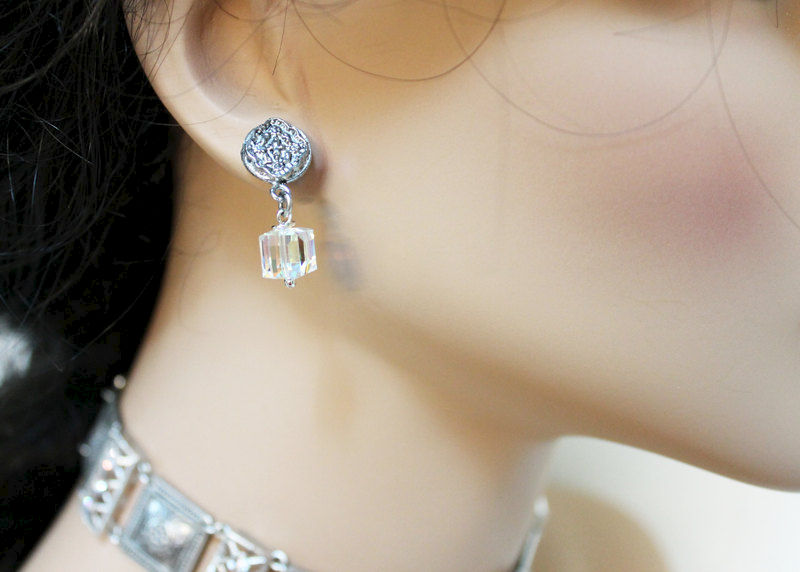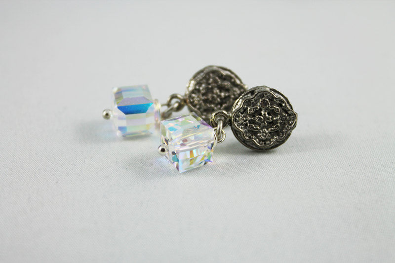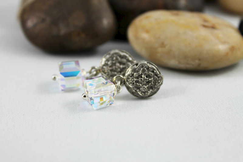 A beautiful 8mm Swarovski crystal AB cube has been wire wrapped and linked to a lovely 11mm oxidized silver over brass medallion like stamping with a surgical steel post. These gorgeous earrings measure approximately 28mm (or 1.25") from the top of the medallion to the bottom of the crystal.