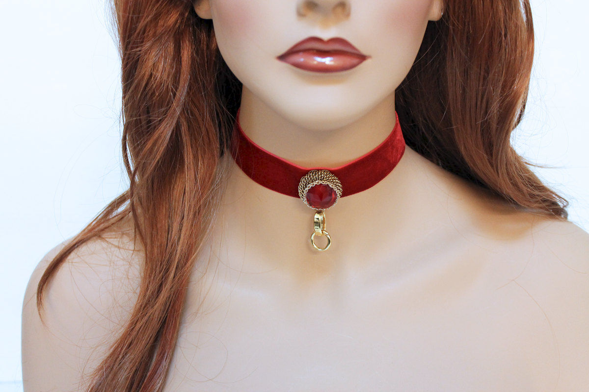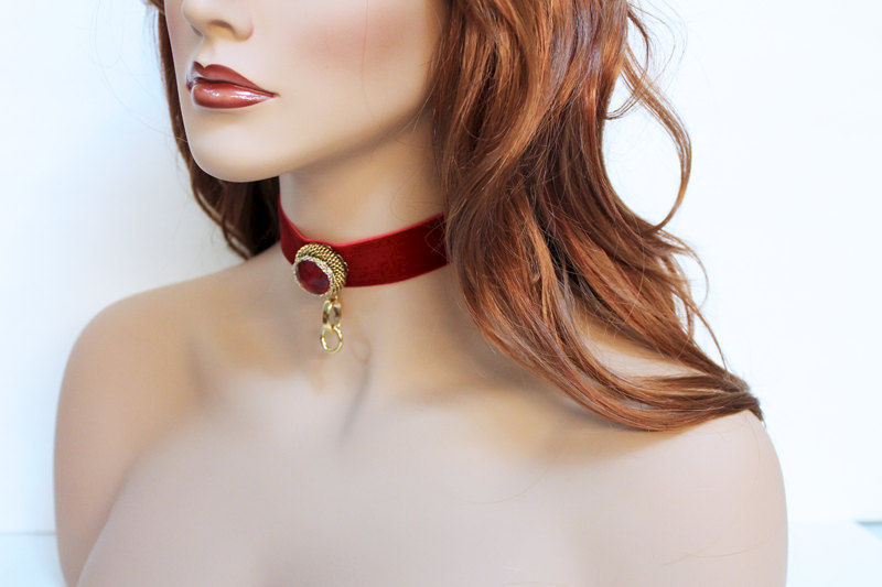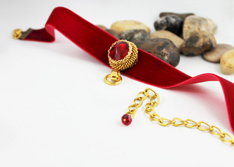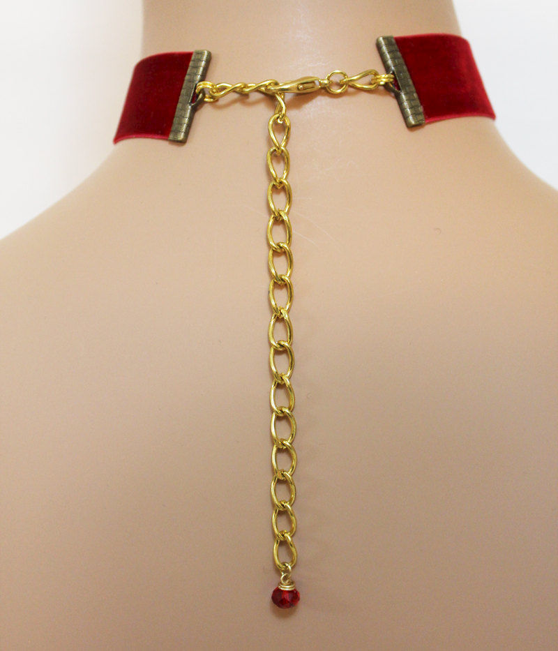 This red velvet choker necklace is so bold! I have repurposed a vintage round clip into a beautiful setting for the red faceted crystal. Dangling from the center of this setting are two gold tone rings giving this choker an edgy feel. Measures approximately 12.5" with a 6" extension.