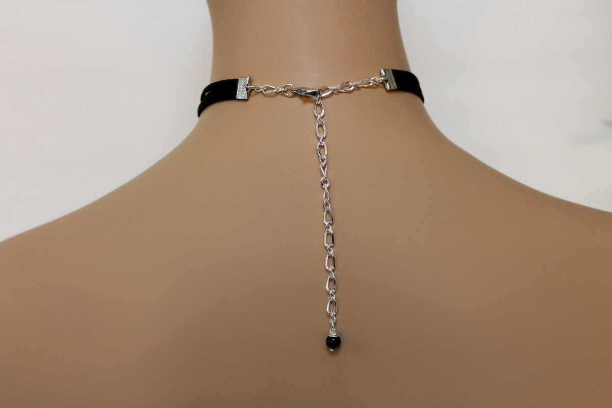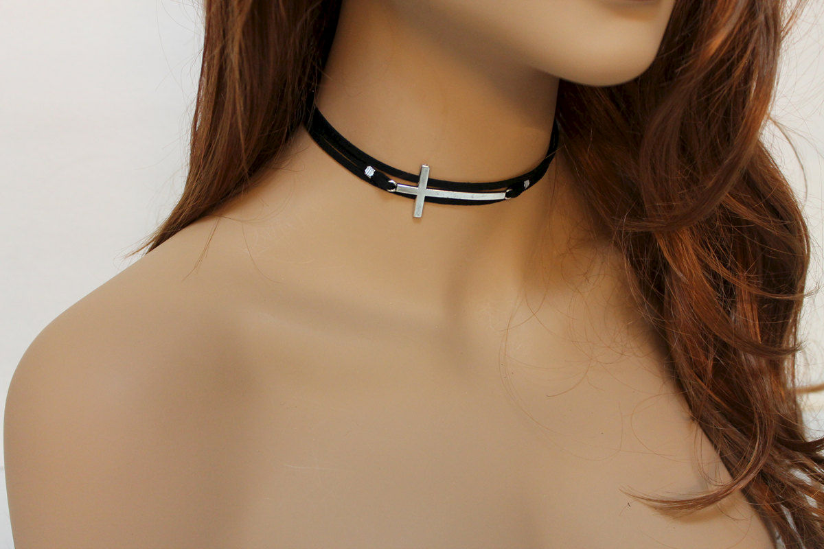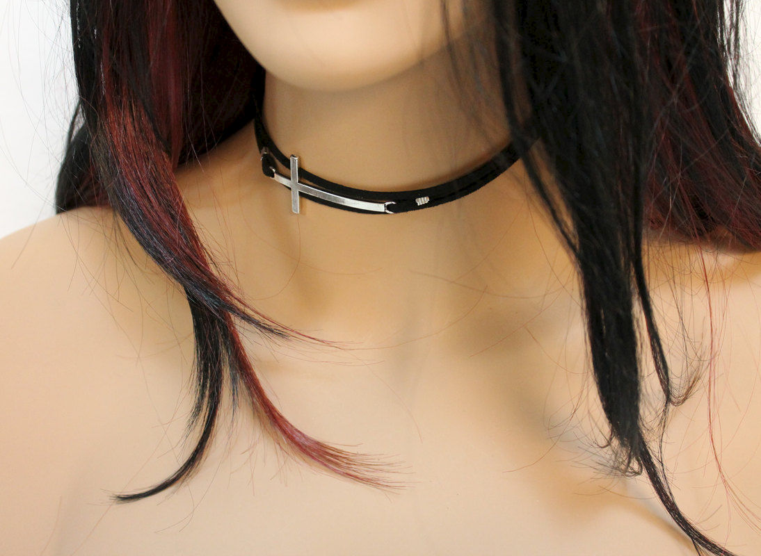 Three strands of suede have been grouped together with a 2" x 1" silver tone sideways cross as the focal creating this simple but dramatic choker necklace. Measures approximately 12" with lobster clasp and an extension chain.