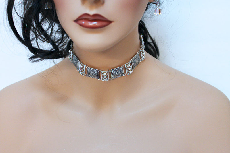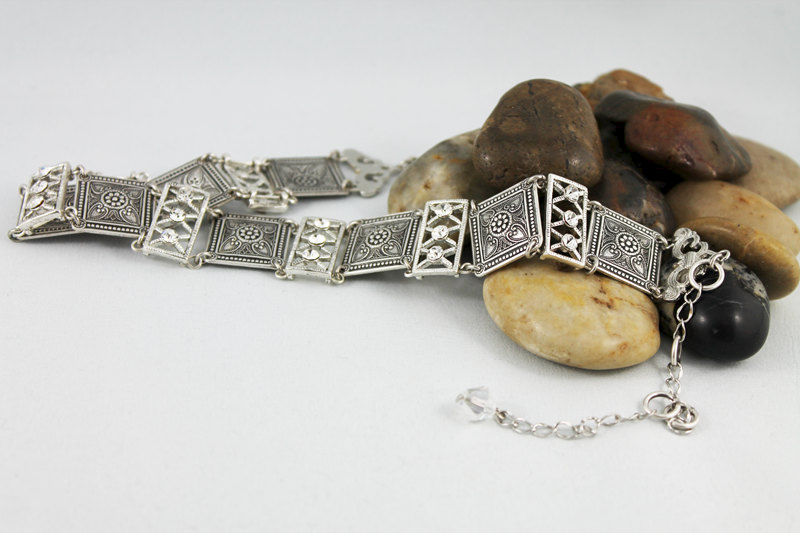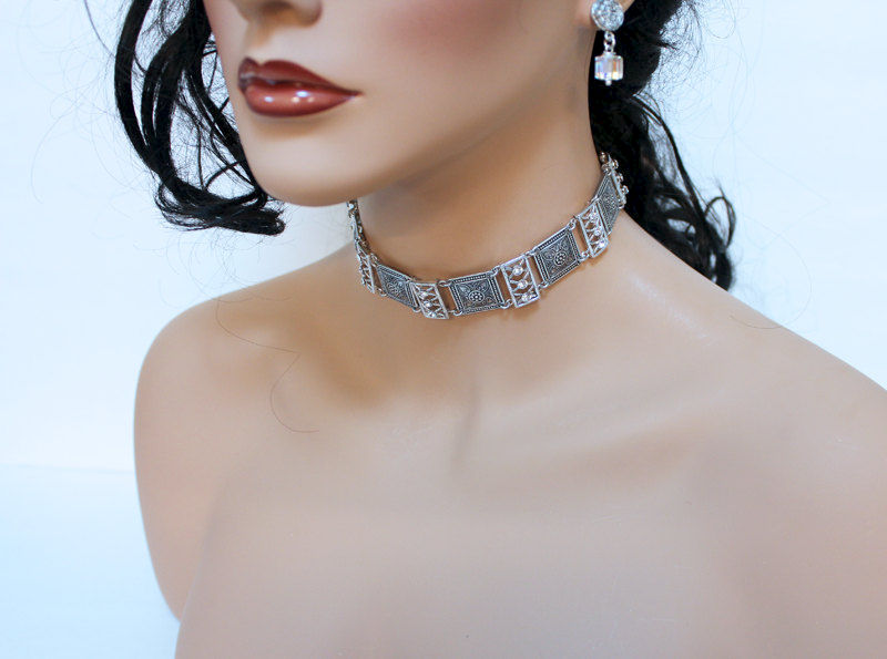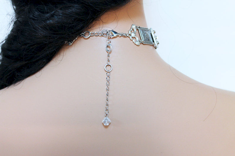 Lovely oxidized silver 18m x 18mm square stampings have been linked together with 21mm x 12mm rectangular crisscross patterned connectors to form this beautiful art deco style choker necklace. Tiny crystals on the connectors add just the right amount of sparkle. Measures approximately 12.5" and a 4.5" extension with a pretty Swarovski AB crystal bead. Simply gorgeous for any bride or for any special occasion!