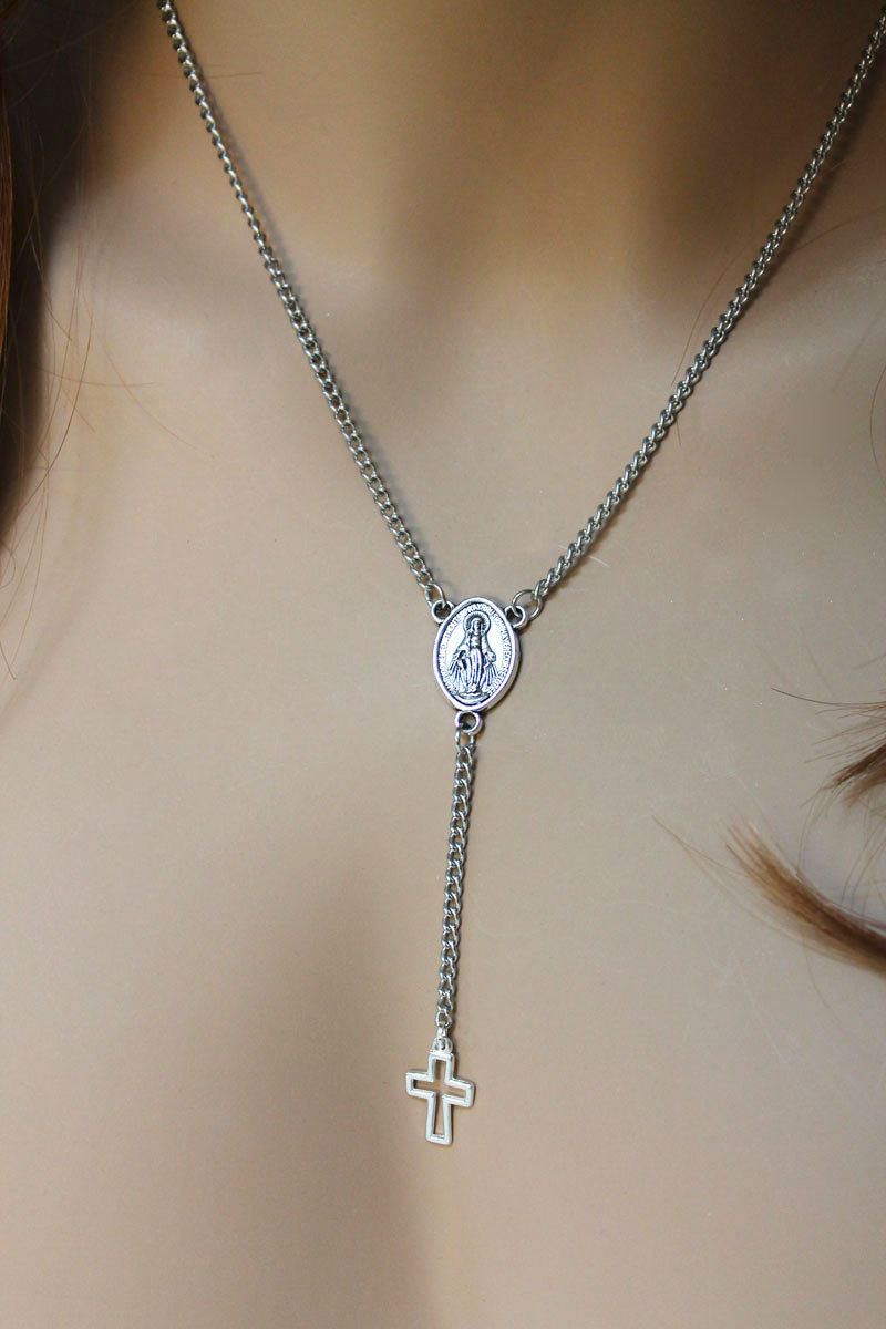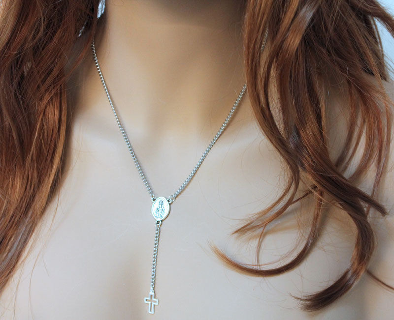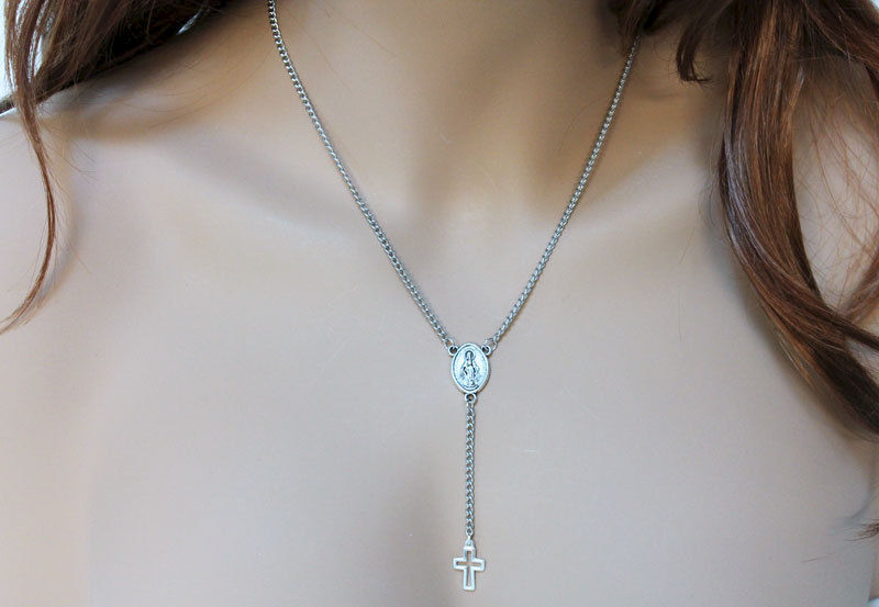 This rosary type necklace has a lovely silver tone Madonna medallion measuring 16 x 12 mm at the center of a silver tone chain. Dangling from the medallion is a 18 x 8 mm silver tone cross. The chain measures 18" with a 2.5" dangle from the top of the medallion to the bottom of the cross.