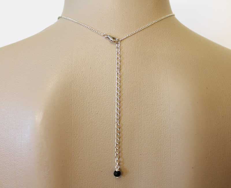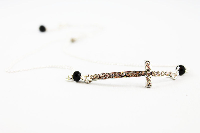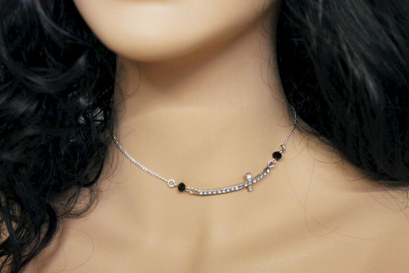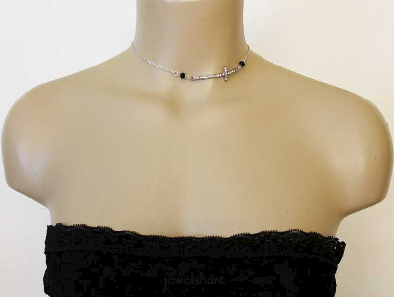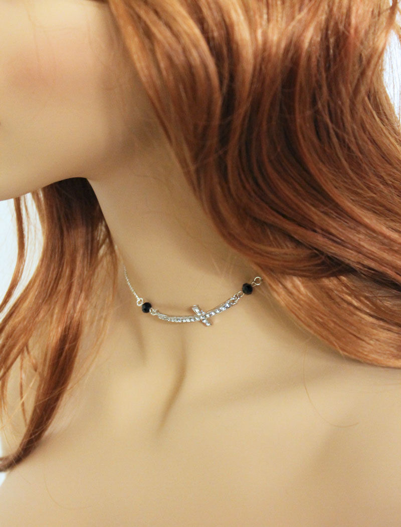 Two pretty 6mm black faceted crystals have been linked to a lovely 50x18mm rhinestone sideways cross in this silver tone choker necklace. Measures approximately 14.5" with a 4.5" extension. Great gift idea for her. Dainty and elegant, perfect for everyday!