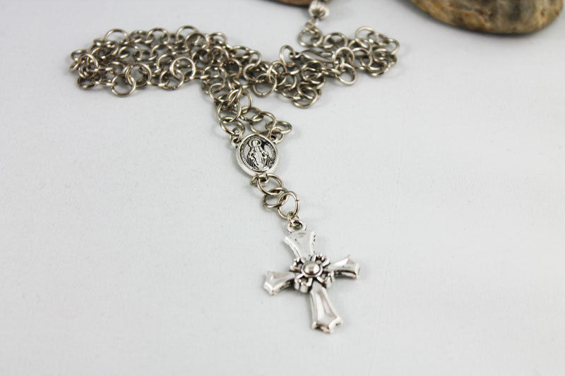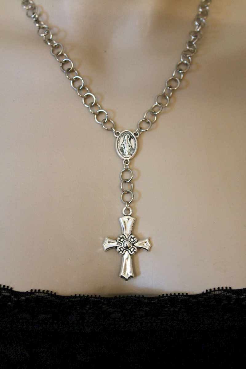 8 mm oxidized silver jump rings have been linked together to form the handmade chain of this lovely rosary style necklace. The 17 x 12 mm Madonna medallion in the center of this necklace is actually double sided so you can wear it both ways. From the medallion dangles more chain which ends with a modern 34 x 27 mm cross pendant. This necklace measures approximately 18" with a 3" extension of the same handmade chain. A 7 mm silver plated ribbed bead completes the end of the chain.