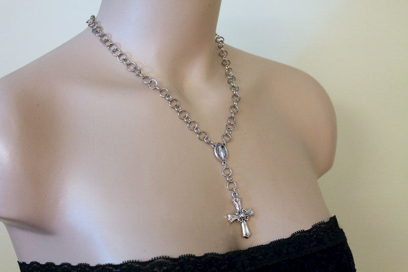 Silver Rosary Cross Necklace