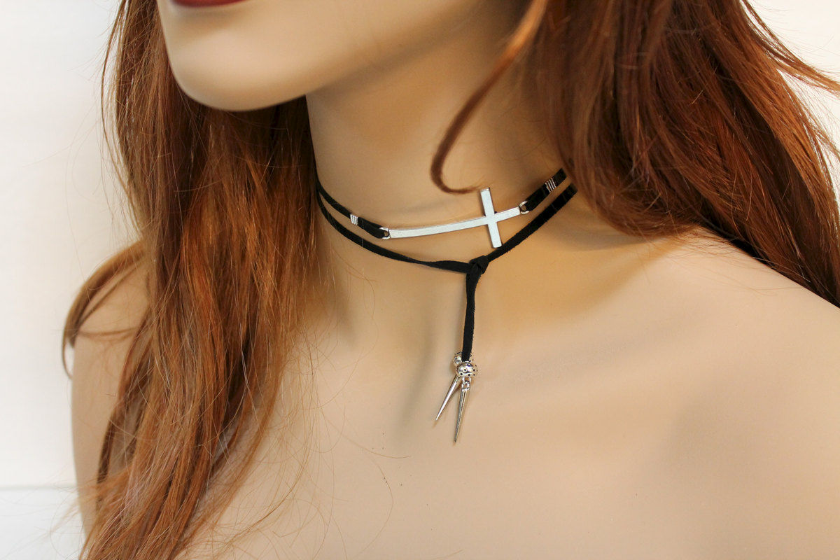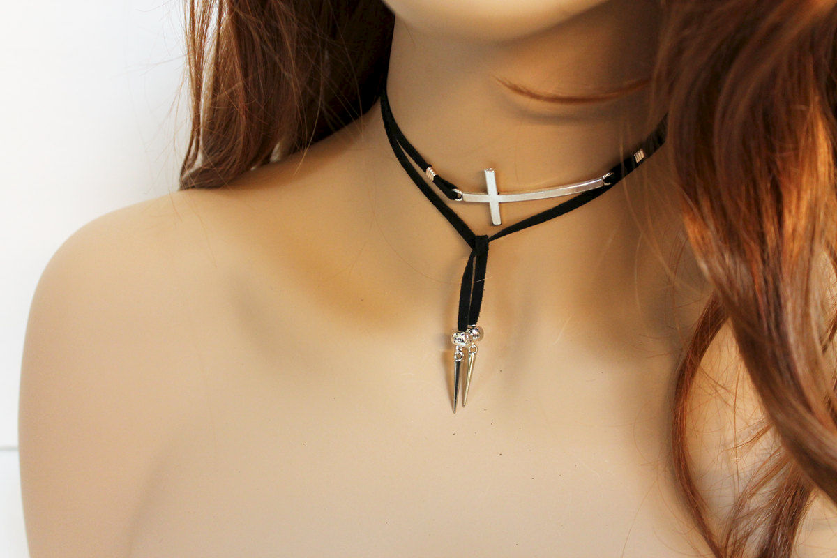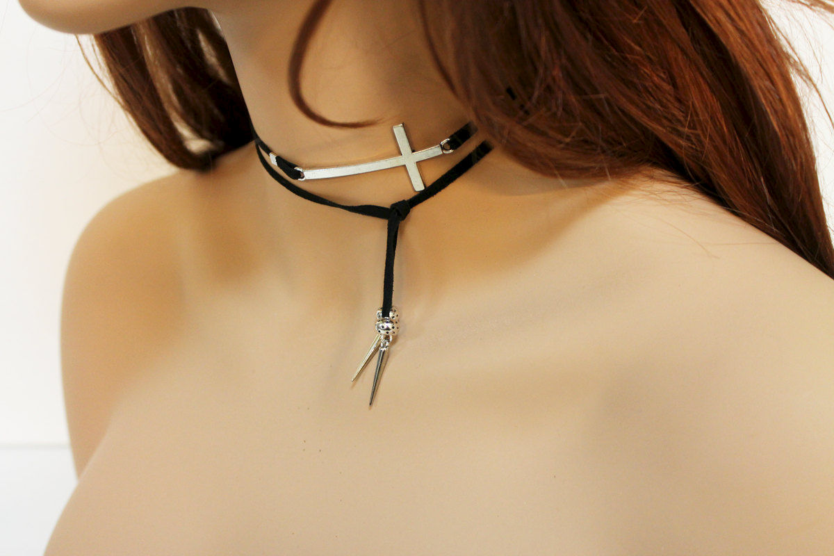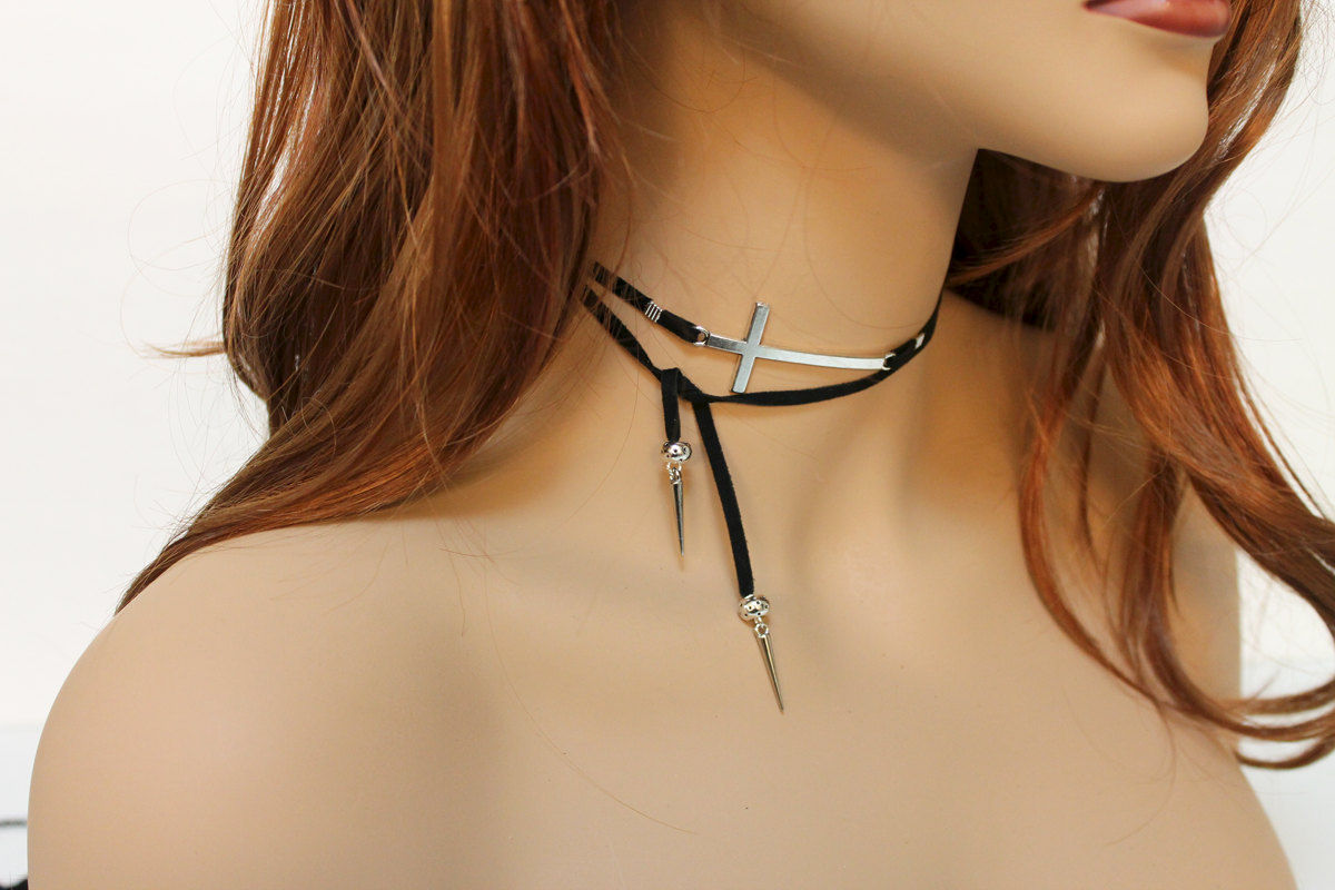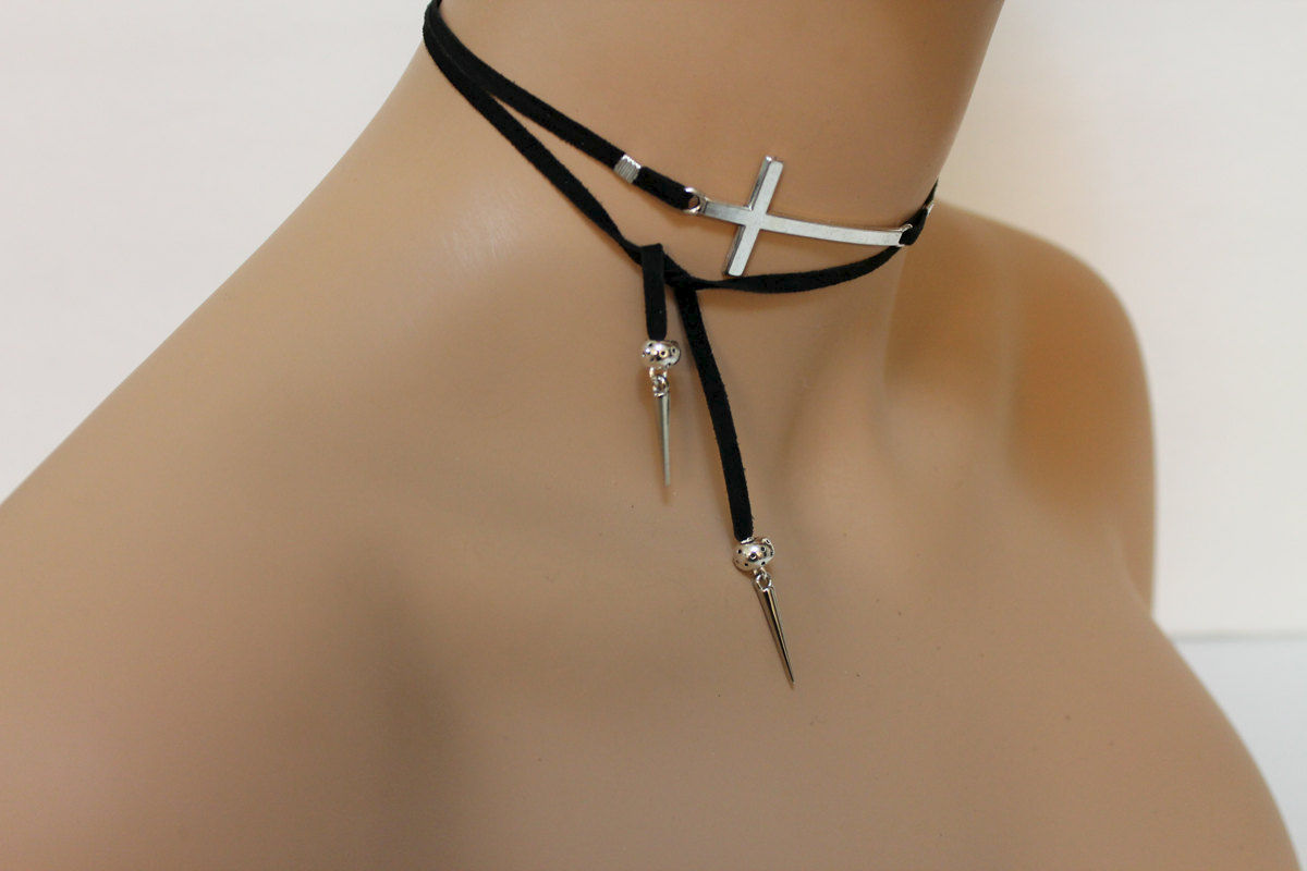 Simple and versatile, this open lariat necklace has a 2" x 1" silver tone sideways cross as the focal. With spikes and spacer beads on both ends, the black soft goat suede can be easily tied as a necklace or an arm band. Great either way! Measures approximately 33"