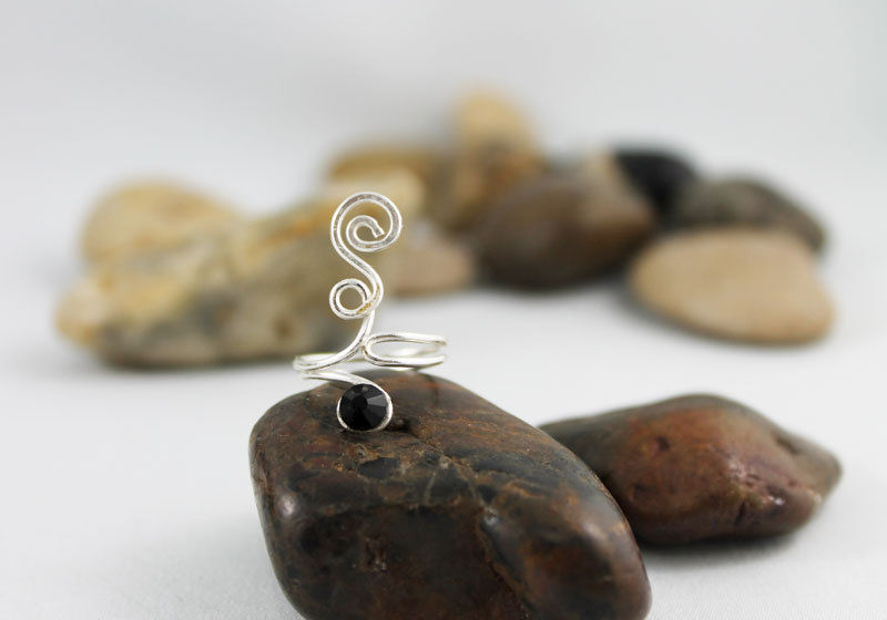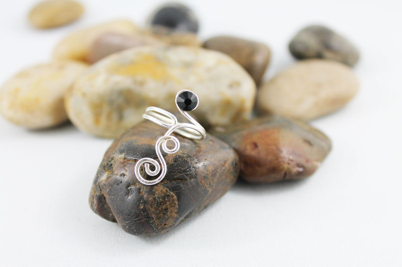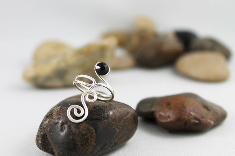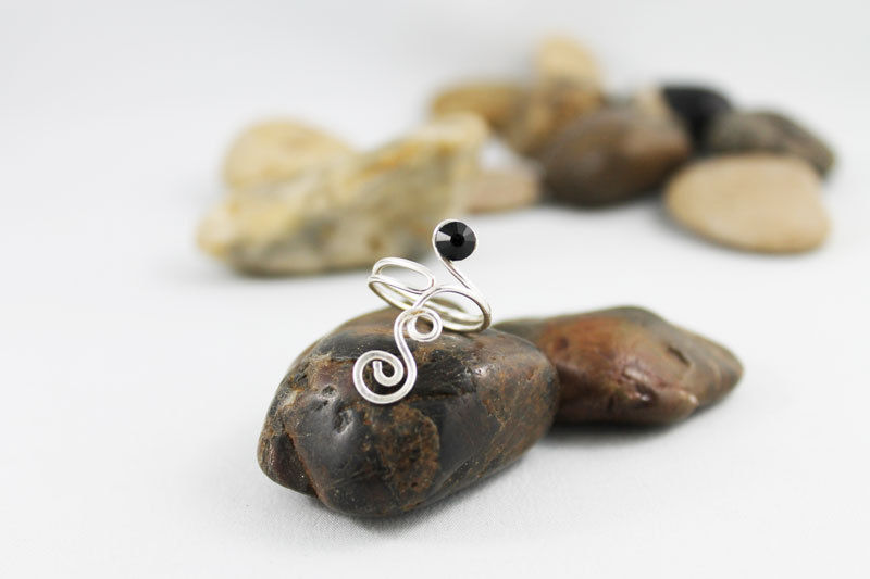 Double swirl spirals are the focal point of this pretty toe ring. Made from non tarnishing silver wire, this ring is wrapped so that it is adjustable. The span of the swirls measures approximately 24mm. I have added a pretty 5mm black crystal for just the right amount of sparkle.