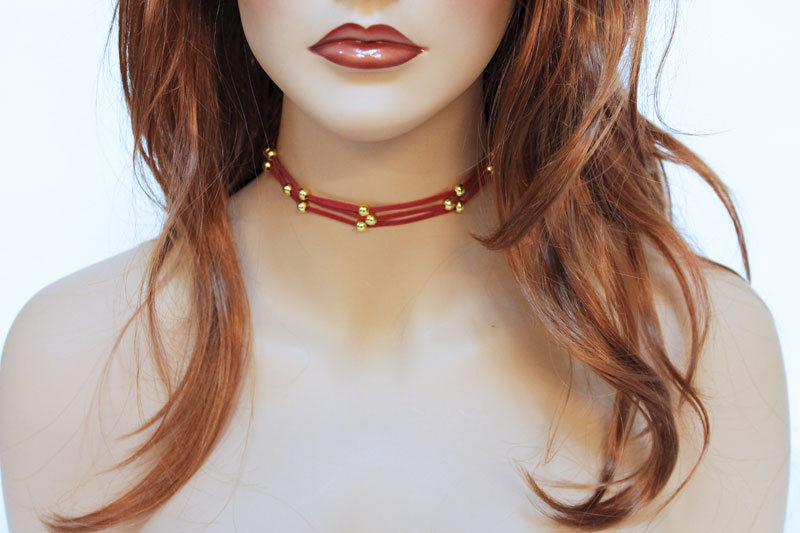 This simple red choker has several 6mm gold tone beads strung on the three strands of suede cord. The beads can be arranged together or spaced apart. Just slide them along the cord to achieve the look you want. The choker measures approximately 12.5" with a 6.5 extension. Extension chain may vary. A great everyday fashion statement!