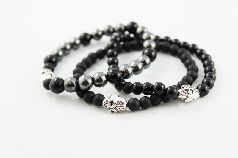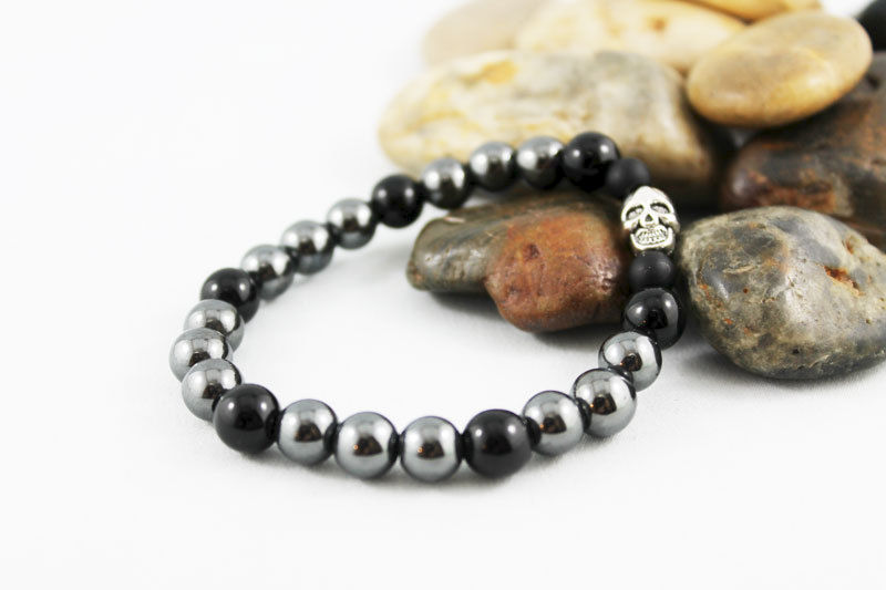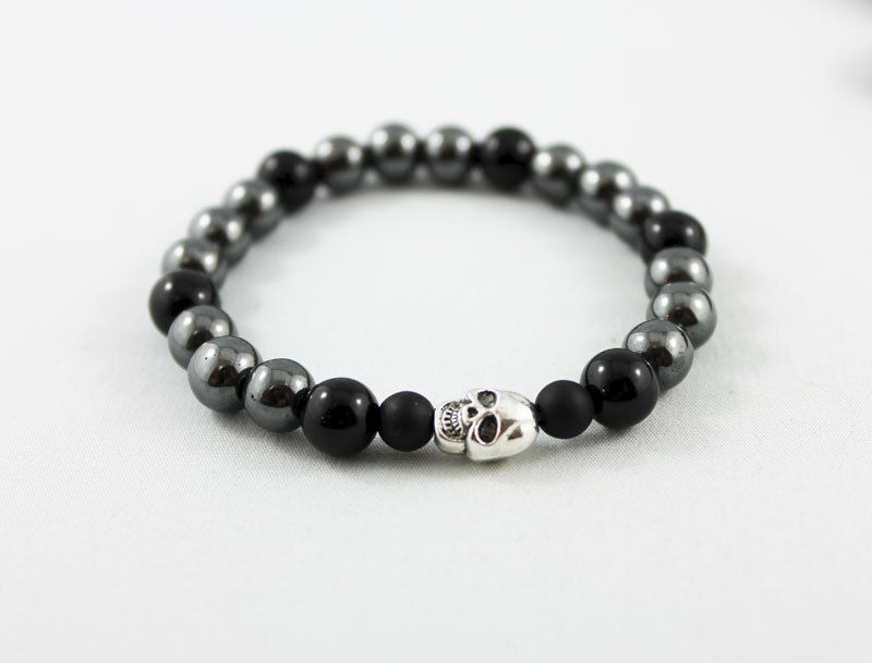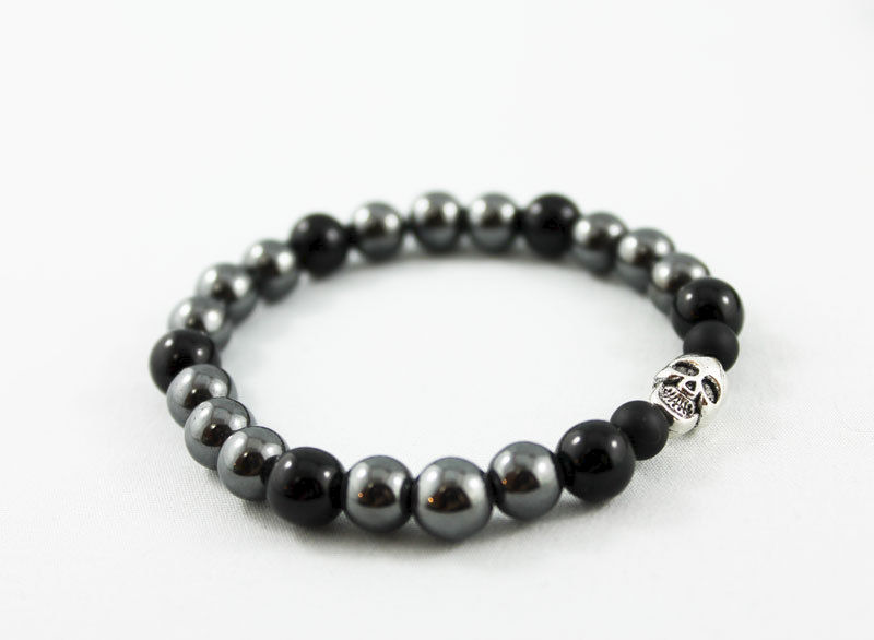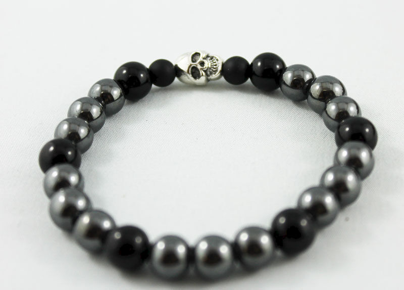8 mm hematite and shiny onyx beads have been strung on an elastic cord (3 to 1 pattern) with two 6mm matte onyx beads on either side of a 10 x 8 mm silver-plated skull bead. Great stacking bracelet for both men and women! Fits 7" wrist.